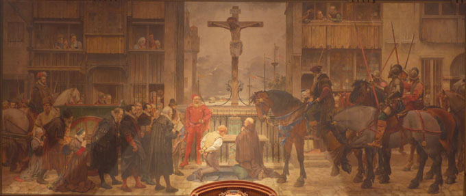 A characteristic example of this worldview is La punition du parjure (1888) by Pieter Van der Ouderaa, in which a perjurer kneels repentantly before the Crucified Christ, underscoring the belief that crime is first of all a sin and that justice must be grounded in moral responsibility.